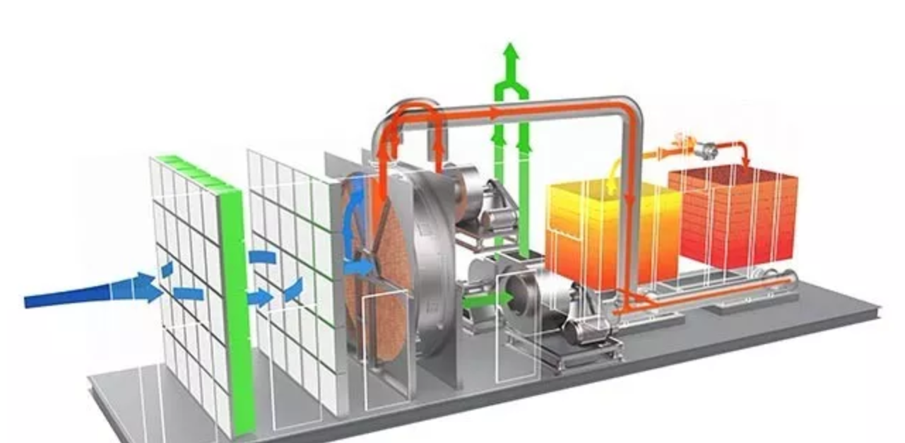 有機(jī)廢氣在RTO氧化室加熱升溫至800℃,使廢氣中的VOC氧化分解成為無(wú)害的CO2和H2O;氧化時(shí)的高溫氣體的熱量被蓄熱體“貯存”起來(lái), 用于預(yù)熱新進(jìn)入的有機(jī)廢氣,從而節(jié)省升溫所需要的燃料消耗,降低運(yùn)行成本。